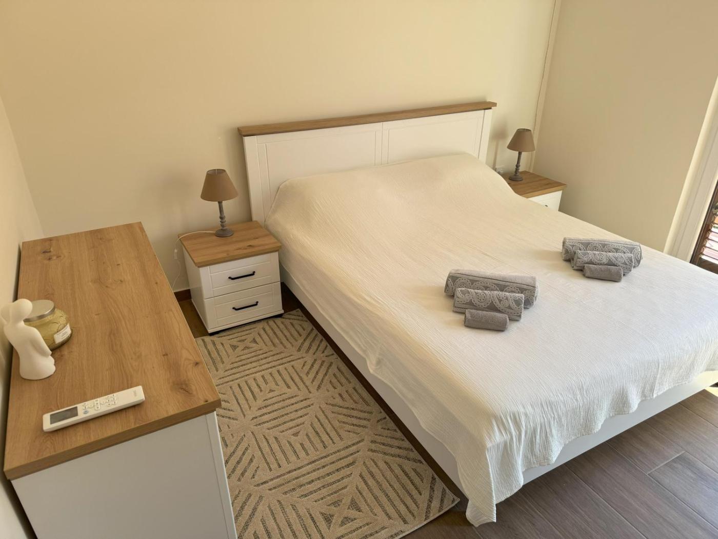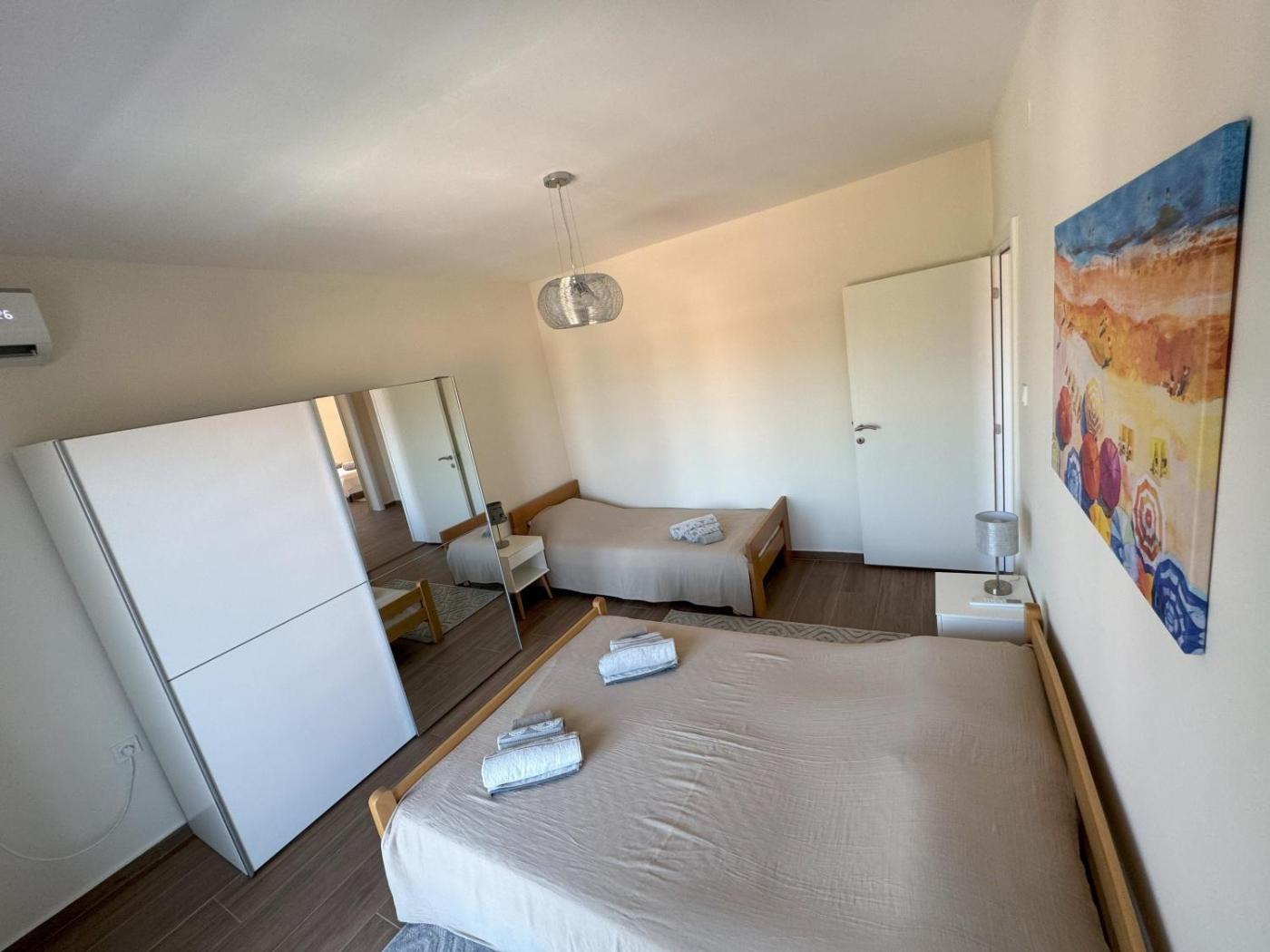 Two-Bedroom Apartment. Featuring a private entrance, this air-conditioned apartment comprises 1 living room, 2 separate bedrooms and 1 bathroom with a walk-in shower and a bath or a shower. In the well-equipped kitchen, guests will find a refrigerator, kitchenware, an oven and a toaster. The spacious apartment provides a washing machine, a seating area, a dining area as well as a terrace with sea views. The unit offers 4 beds.