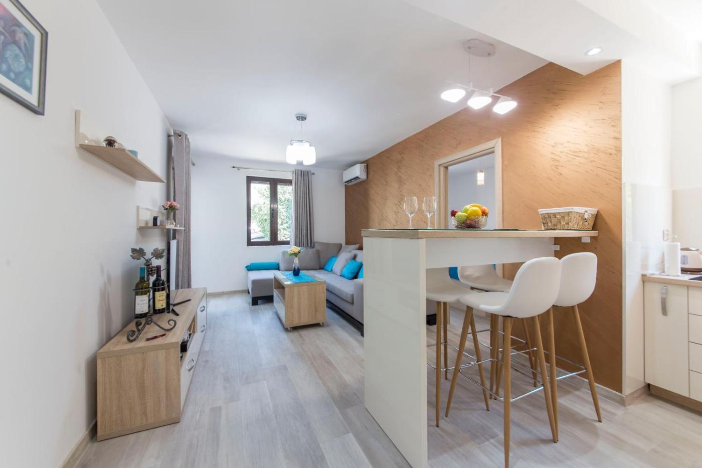 One-Bedroom Apartment. Featuring a private entrance, this air-conditioned apartment comprises 1 living room, 1 separate bedroom and 1 bathroom with a shower and a hairdryer. The well-fitted kitchen has a stovetop, a refrigerator, a dishwasher and kitchenware. This apartment features a washing machine, flat-screen TV with cable channels, sea views, as well as winechampagne for guests. The unit offers 2 beds.